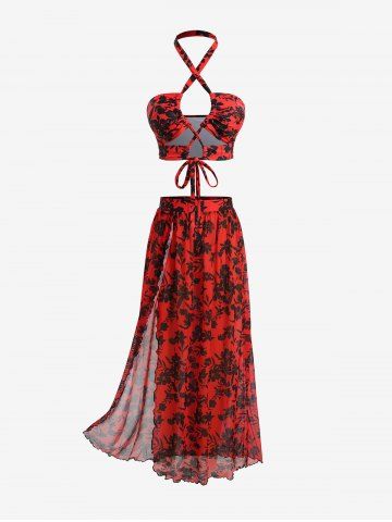 Plus Size Flower Leaf Print Hollow Out Braided Split Halter Three Piece Tankini Swimsuit - Red - 2xl