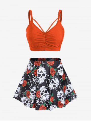 Plus Size Gothic Rose Skulls Printed Ruched Padded Tankini Set Swimsuit - Orange - M | Us 10