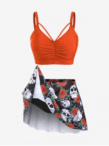 Plus Size Gothic Rose Skulls Printed Ruched Padded Tankini Set Swimsuit - Orange - 1x | Us 14-16