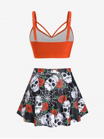 Plus Size Gothic Rose Skulls Printed Ruched Padded Tankini Set Swimsuit - Orange - 3x | Us 22-24