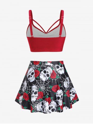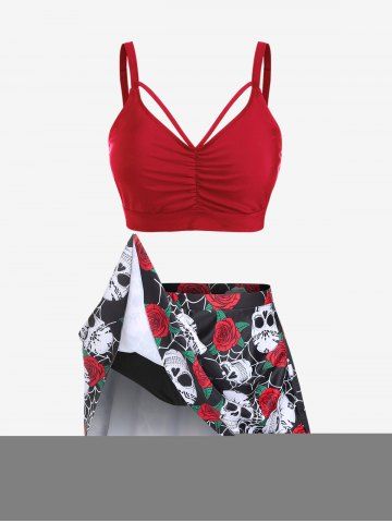 Plus Size Gothic Rose Skulls Printed Ruched Padded Tankini Set Swimsuit - Red - 4x | Us 26-28
