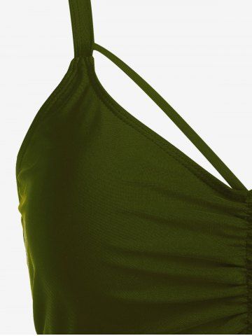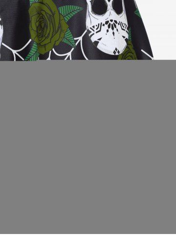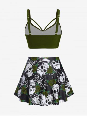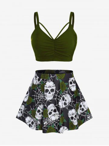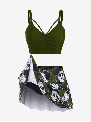Plus Size Gothic Rose Skulls Printed Ruched Padded Tankini Set Swimsuit - Deep Green - L | Us 12