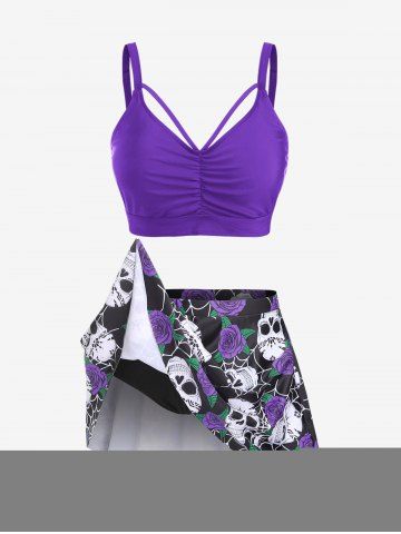 Plus Size Gothic Rose Skulls Printed Ruched Padded Tankini Set Swimsuit - Purple - 1x | Us 14-16