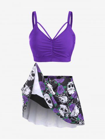 Plus Size Gothic Rose Skulls Printed Ruched Padded Tankini Set Swimsuit - Purple - 3x | Us 22-24