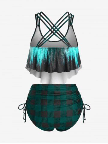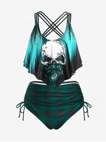 Plus Size Gothic Skull Checkerboard Strappy Cinched Ruched Overlay Tankini Swimsuit - Deep Green - 5x