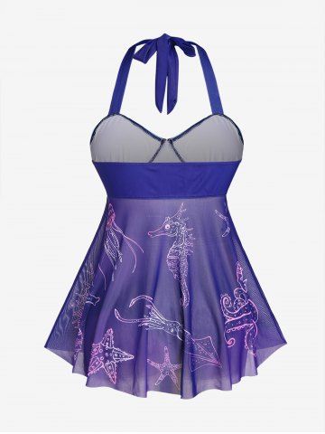 Plus Size Mesh Panel Marine Life Printed Padded Halter Tankini Swimsuit - Blue - 1x | Us 14-16