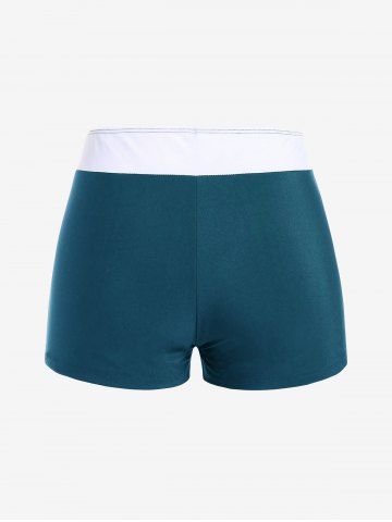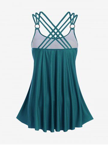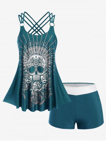 Plus Size Modest Skull Rose Print Rings Crisscross Boyshorts Tankini Swimsuit - Deep Green - 3x | Us 22-24