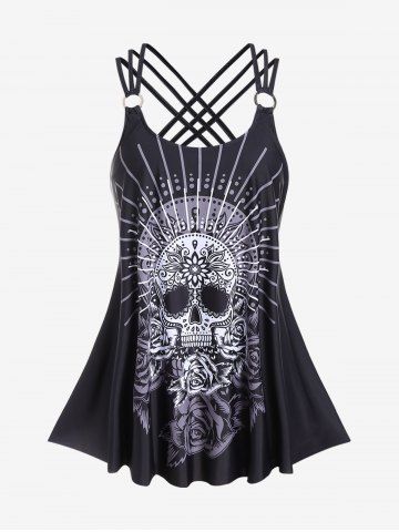 Plus Size Tankinis > Plus Size Modest Skull Rose Print Rings Crisscross Boyshorts Tankini Swimsuit