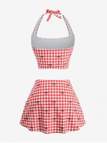 Plus Size Plaid Bowknot Print Lace Up Split Halter Tankini Swimsuit - Red - M | Us 10