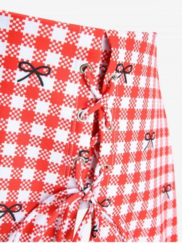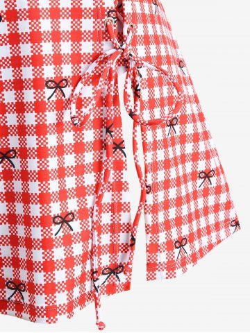 Plus Size Plaid Bowknot Print Lace Up Split Halter Tankini Swimsuit - Red - 4x | Us 26-28