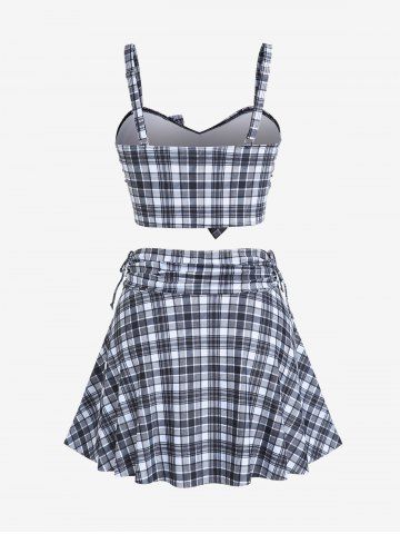 Plus Size Tankinis > Plus Size Plaid Cinched Bowknot Padded Longline Bikini Three Piece Swimsuit