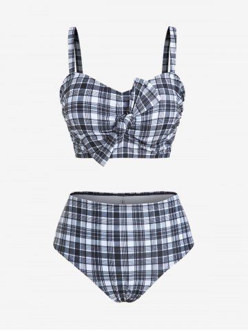 Plus Size Tankinis > Plus Size Plaid Cinched Bowknot Padded Longline Bikini Three Piece Swimsuit