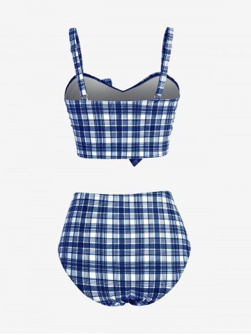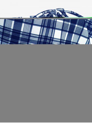 Plus Size Plaid Cinched Bowknot Padded Longline Bikini Three Piece Swimsuit - Deep Blue - 1x | Us 14-16