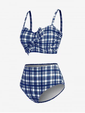 Plus Size Plaid Cinched Bowknot Padded Longline Bikini Three Piece Swimsuit - Deep Blue - 2x | Us 18-20