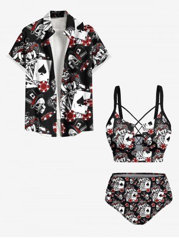 Plus Size Poker Skull Print Lace Up Panel Hawaii Tankini Swimsuit - Black - M