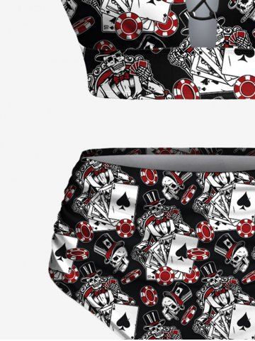 Plus Size Poker Skull Print Lace Up Panel Hawaii Tankini Swimsuit - Black - L