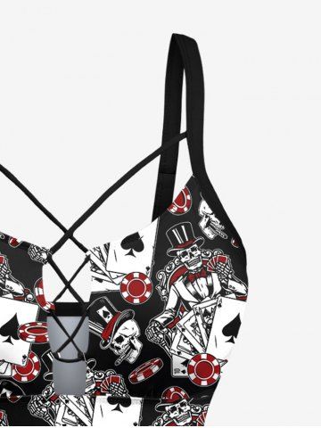 Plus Size Poker Skull Print Lace Up Panel Hawaii Tankini Swimsuit - Black - 1x