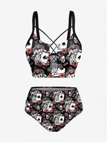 Plus Size Poker Skull Print Lace Up Panel Hawaii Tankini Swimsuit - Black - 5x