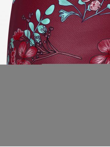 Plus Size Ruched Flower Leaves Print Boyleg Tankini Swimsuit - Red Wine - L | Us 12