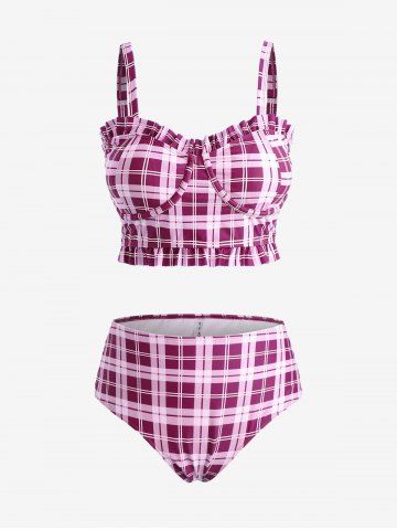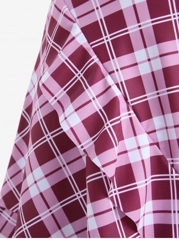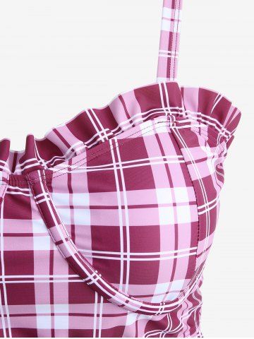 Plus Size Ruffles Flounce Padded Plaid Three Piece Skirt Tankini Swimsuit - Deep Red - 5x | Us 30-32