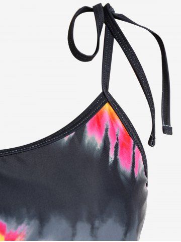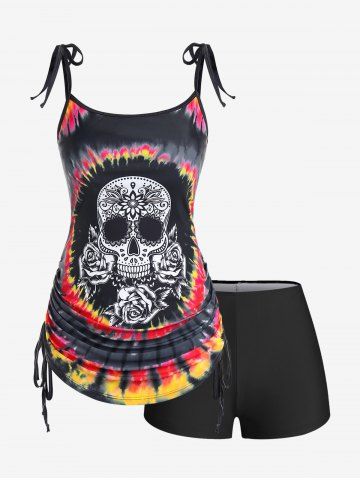 Plus Size Skull Rose Tie Dye Print Cinched Ruched Tie Boyshorts Tankini Swimsuit - Black - L | Us 12