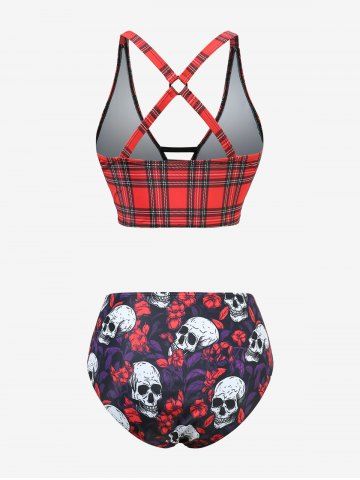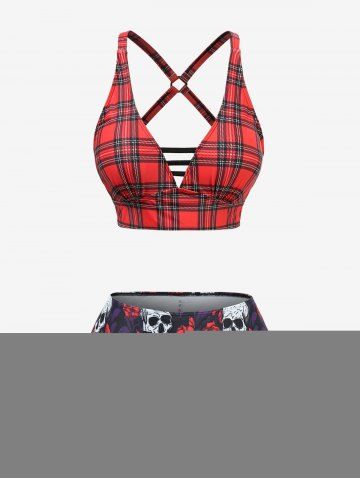 Plus Size Skulls Flowers Leaf Plaid Print Crisscross Cinched Skirt 3 Piece Tankini Swimsuit - Red - L | Us 12