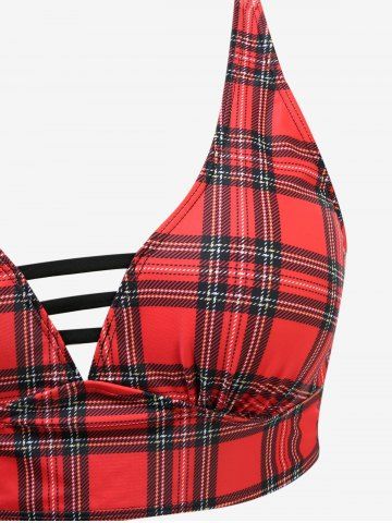 Plus Size Skulls Flowers Leaf Plaid Print Crisscross Cinched Skirt 3 Piece Tankini Swimsuit - Red - 4x | Us 26-28