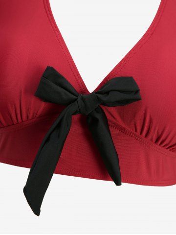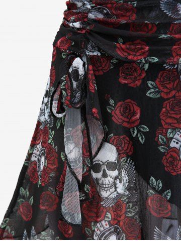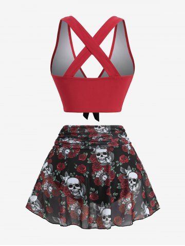 Plus Size Skulls Rose Flowers Print Skirt Bowknot Crisscross Straps Tankini Swimsuit - Red - 1x | Us 14-16