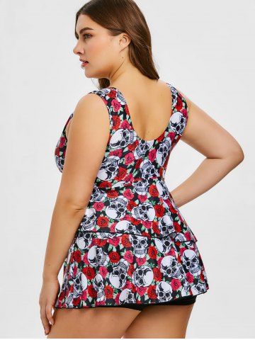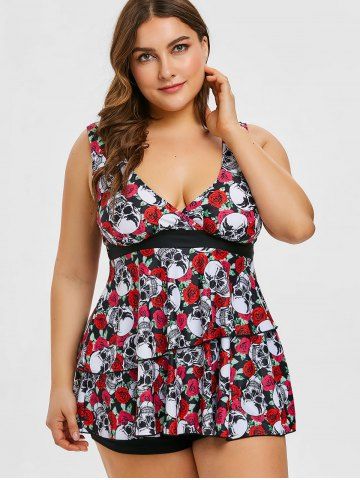 Plus Size Skulls Rose Flowers Print Surplice Layered Boyshorts Tankini Set - Red - 4x | Us 26-28