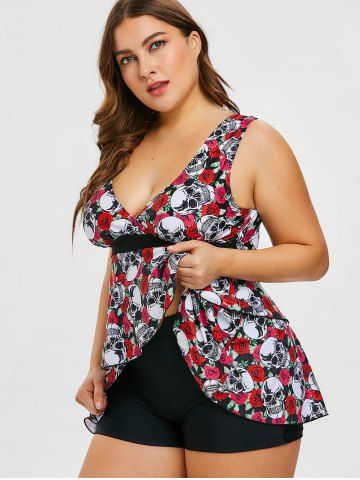 Plus Size Tankinis > Plus Size Skulls Rose Flowers Print Surplice Layered Boyshorts Tankini Set