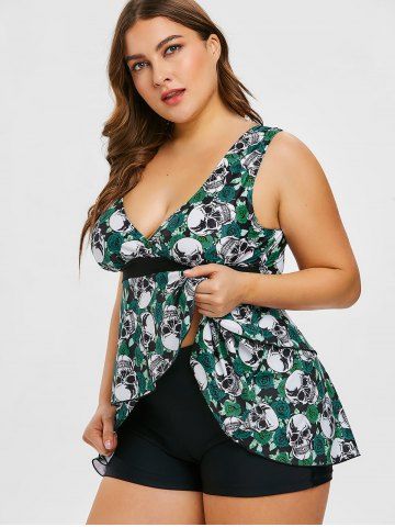 Plus Size Skulls Rose Flowers Print Surplice Layered Boyshorts Tankini Set - Deep Green - 3x | Us 22-24