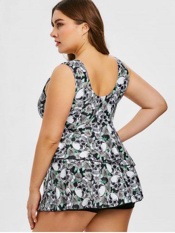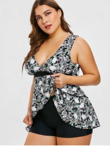 Plus Size Skulls Rose Flowers Print Surplice Layered Boyshorts Tankini Set - Gray - 3x | Us 22-24