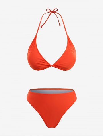 Plus Size Solid Halter Tankini Swimsuit with Ombre Print Cinched Ruched Cover Up Three Piece Set - Red - 1xl