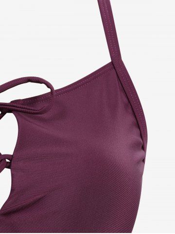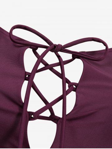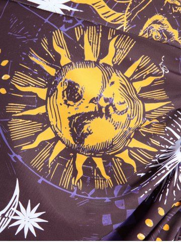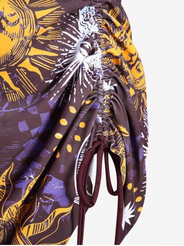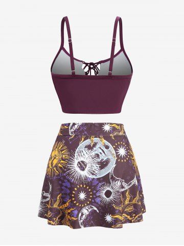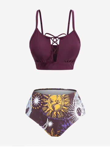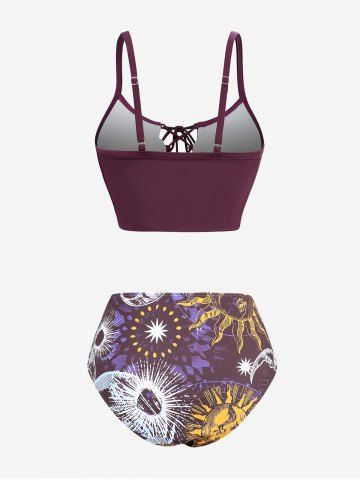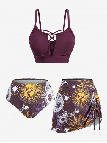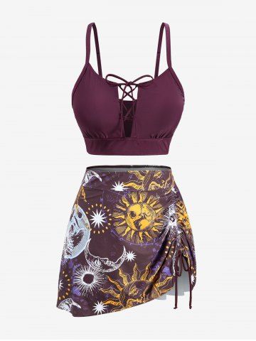 Plus Size Sun Moon Star Planet Print Cinched Lace Up Three Piece Tankini Swimsuit (Adjustable Shoulder Strap) - Red Wine - M | Us 10