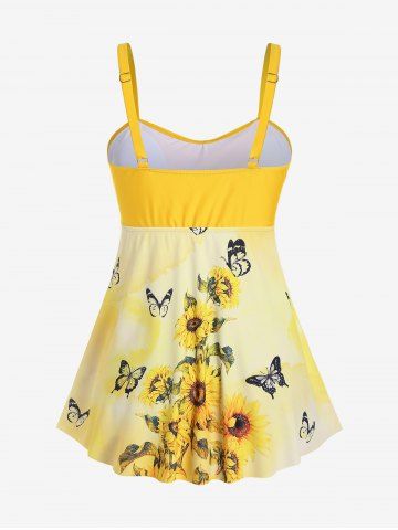 Plus Size Sunflower Butterfly Printed Twist Boyleg Tankini Swimsuit - Yellow - M | Us 10