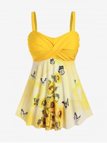Plus Size Sunflower Butterfly Printed Twist Boyleg Tankini Swimsuit - Yellow - 2x | Us 18-20