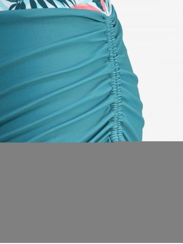 Plus Size Tropical Leaf Hibiscus Flower Flamingo Zig Zag Print Hawaii Cinched Boyleg Tankini Swimsuit - White - L | Us 12