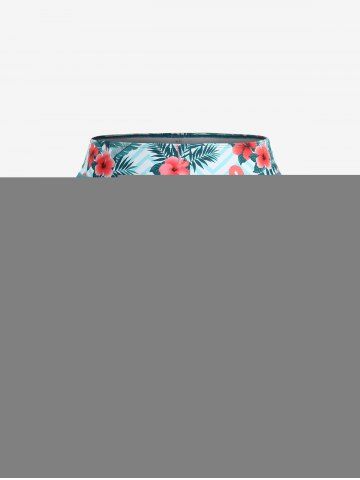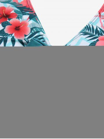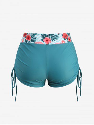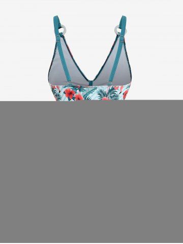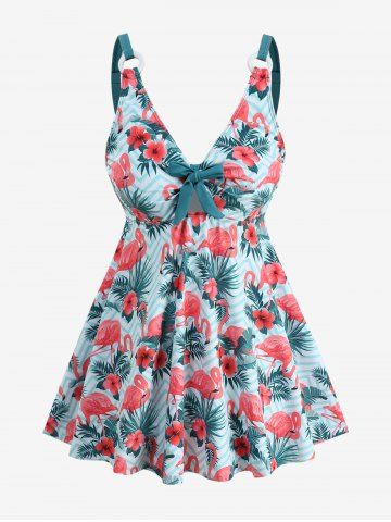 Plus Size Tankinis > Plus Size Tropical Leaf Hibiscus Flower Flamingo Zig Zag Print Hawaii Cinched Boyleg Tankini Swimsuit