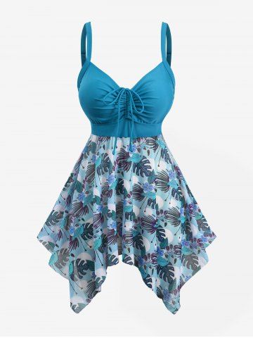 Plus Size Tropical Leaf Hibiscus Flower Print Cinched Boyleg Tankini Swimsuit (Adjustable Shoulder Strap) - Peacock Blue - 3x | Us 22-24