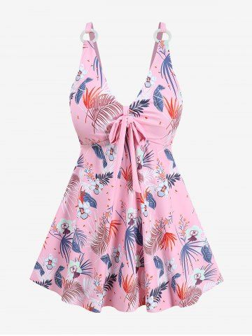 Plus Size Tropical Leaf Hibiscus Flower Print Hawaii Tied Boyleg Tankini Swimsuit (Adjustable Shoulder Strap) - Light Pink - 2x | Us 18-20