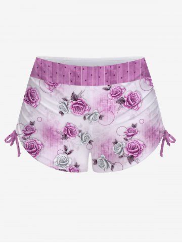 Rose Flower Leaf Circle Dot Stripes Print Halter Twist Cinched Boyshort Tankini Set - Light Pink - L
