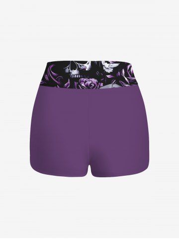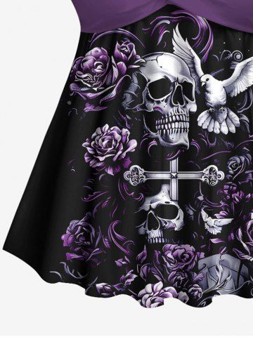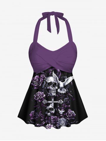 Skull Cross Flower Bird Print Twist Halter Backless Boyleg Tankini Swimsuit - Purple - 5x