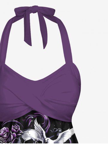 Skull Cross Flower Bird Print Twist Halter Backless Boyleg Tankini Swimsuit - Purple - 6x