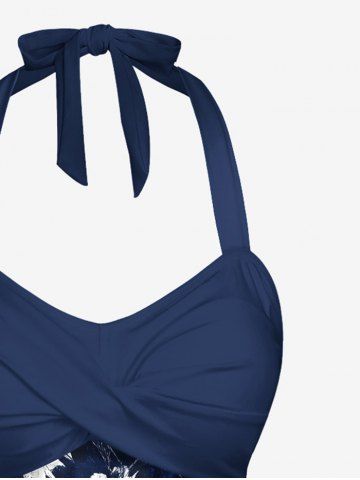 Skull Flower Tree Branch Print Hawaii Twist Halter Backless Boyleg Tankini Swimsuit - Deep Blue - 2x
