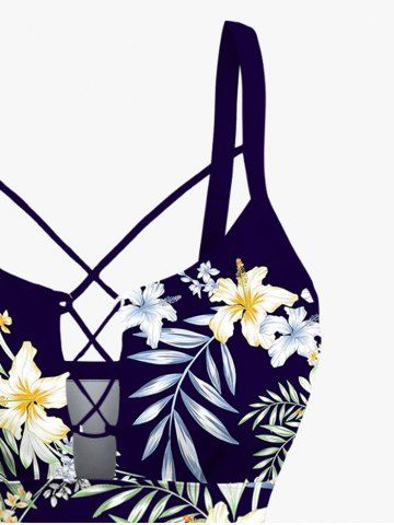 Plus Size Tankinis > Tropical Leaves Branch Hibiscus Floral Printed Hawaii Lace Up Tankini Swimsuit (Adjustable Shoulder Strap)