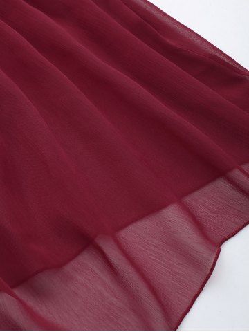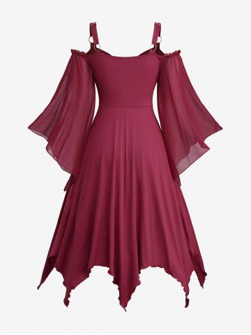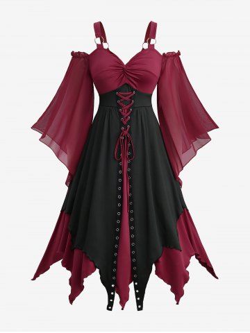 Plus Size Cold Shoulder Chiffon Flare Sleeves Twist Lace Up Grommet Two Tone Layered Asymmetric Vintage Dress - Red - 3x | Us 22-24