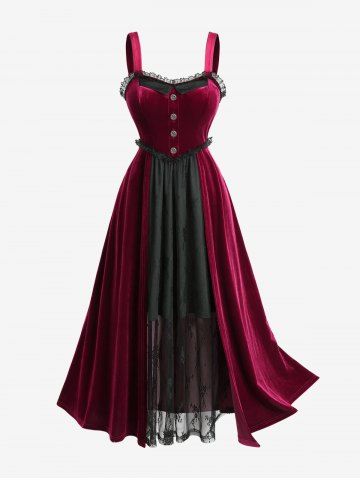 Vintage Dresses > Plus Size Floral Lace Mock Buttons Velvet Vintage A Line Dress