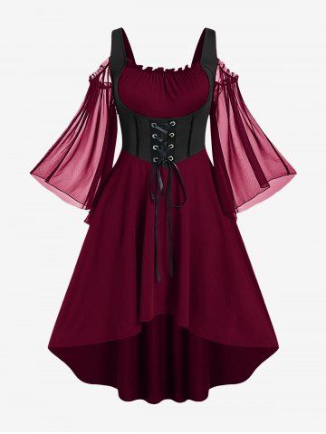 Vintage Dresses > Plus Size Lace Up Cold Shoulder Flare Sleeves High Low Ruched Renaissance Corset Dress