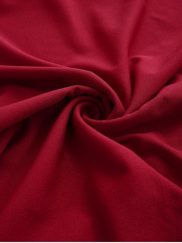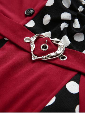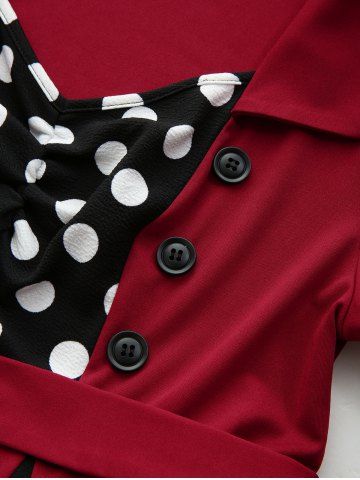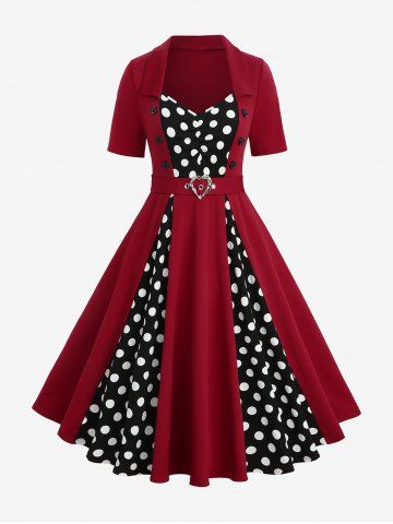 Plus Size Polka Dot Print Mock Buttons Heart Buckle Turn-down Collar Patchwork Ruched Vintage A Line Dress - Deep Red - L | Us 12