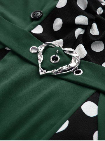 Plus Size Polka Dot Print Mock Buttons Heart Buckle Turn-down Collar Patchwork Ruched Vintage A Line Dress - Deep Green - 5x | Us 30-32